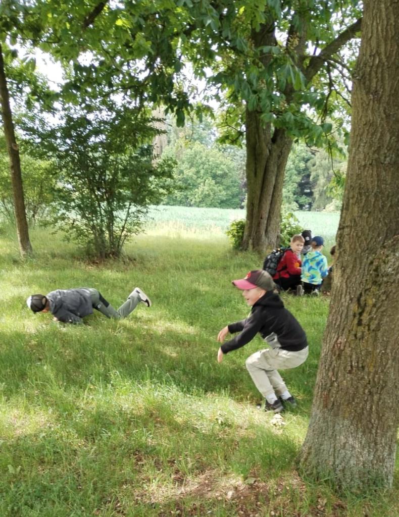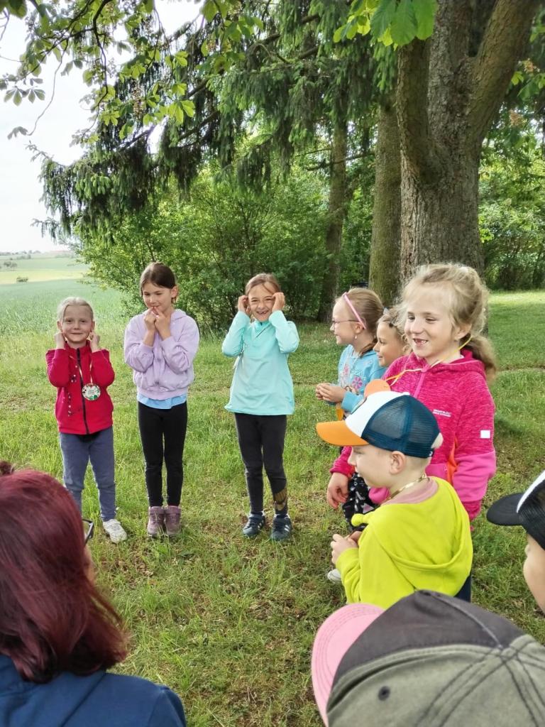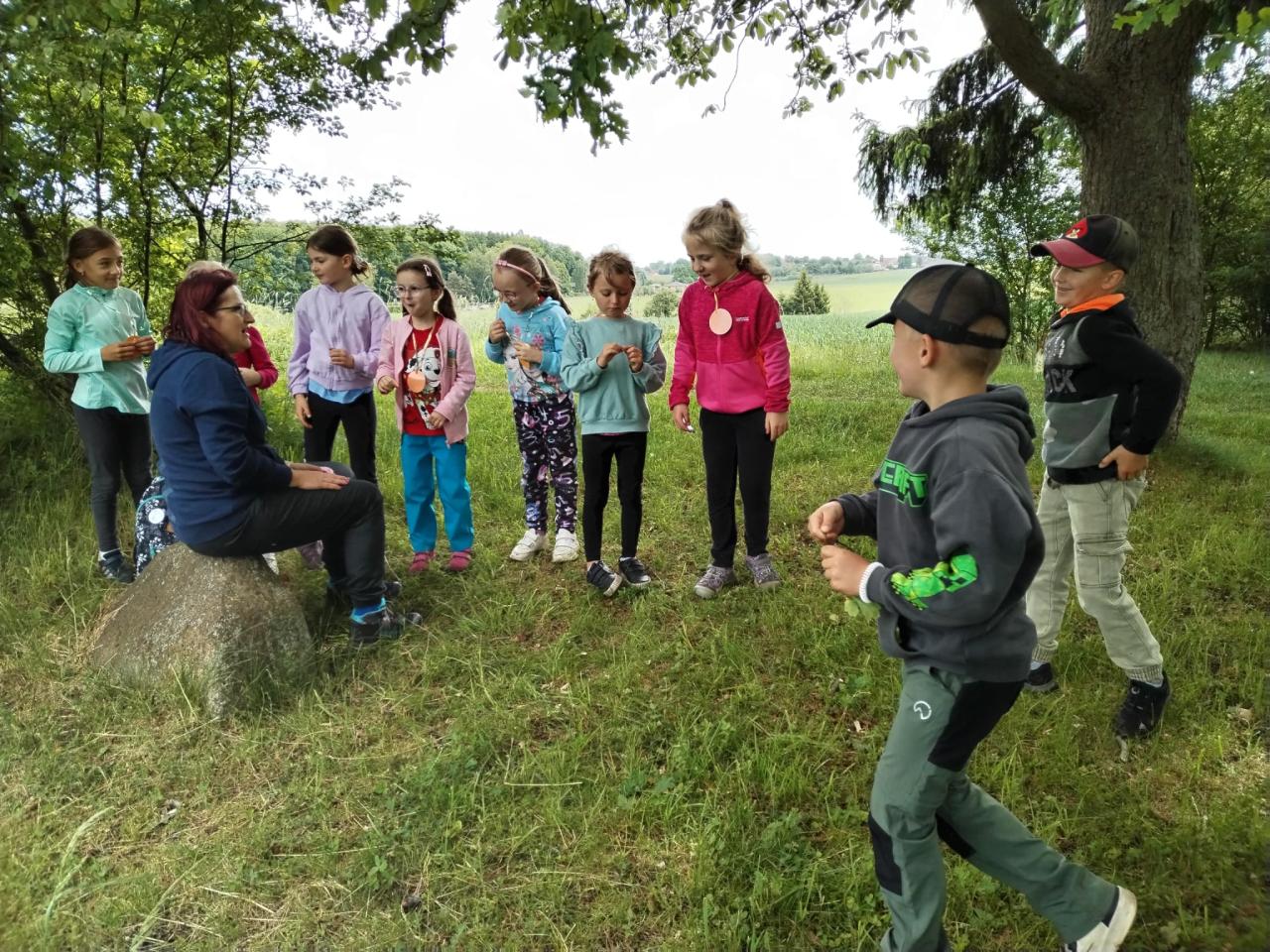 Většina dětí tam byla poprvé. Ukazovali jsme si klikatou cestu Černovického potoka, rozličné přírodní zajímavosti. Děti přicházely se svými nálezy a hodně se ptaly. V Libouši jsme si zahráli fáborkovou pátračku s kvízem. Všichni ji dokázali vyluštit a odnesli si medaili Znalce. Pak následovala svačinka a další část cesty. U Mochomůrky jsme si ještě zahráli pár her. Vysportovaní a hladoví jsme zamířili zpět do školy.