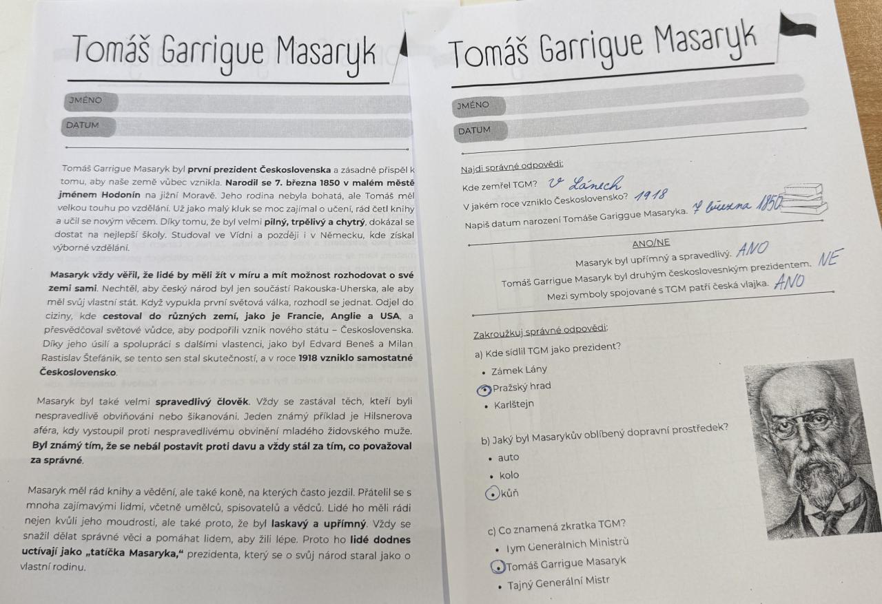 Celý projekt jsme zahájili u nových informačních tabulí našich panovníků, který nás pomocí QR kódu přenesl na speciální webovou stránku, kde na nás promluvil T. G. Masaryk a uvedl nás do tématu. Součástí projektu byly i pracovní listy, které jsme si sami připravili. Tyto listy obsahovaly otázky, myšlenkové mapy a úkoly, které nám pomáhaly lépe pochopit význam 28. října a roli Tomáše Garrigue Masaryka v historii naší země a podpořit naše kritické myšlení a kreativitu.