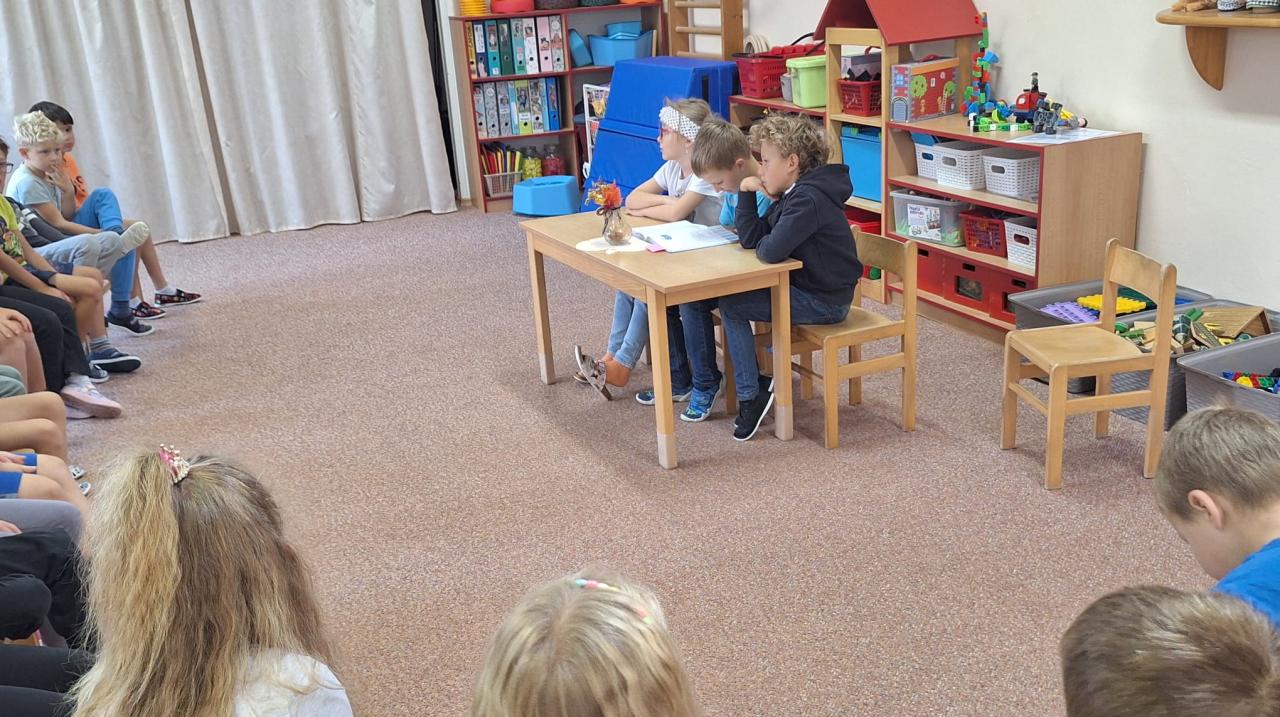 Nesly s sebou pohádkové knížky, aby ukázaly mladším kamarádům, předškoláčkům, jak se za první rok ve škole naučily krásně číst. Všichni se rozdělili do pěti tříd a přečetli školkáčkům pohádky O slepičce Pepičce a Hrnečku, vař. Na závěr se mohli všichni alespoň na chvilku vrátit k hračkám, které před více než rokem opustili.