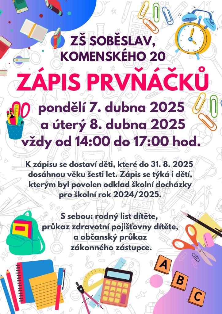 Registrace k zápisu pro školní rok 2025/2026 proběhne v období 4. března až 8. dubna 2025 pomocí rezervačního formuláře na webových stránkách školy (www.zssobeslav.cz).